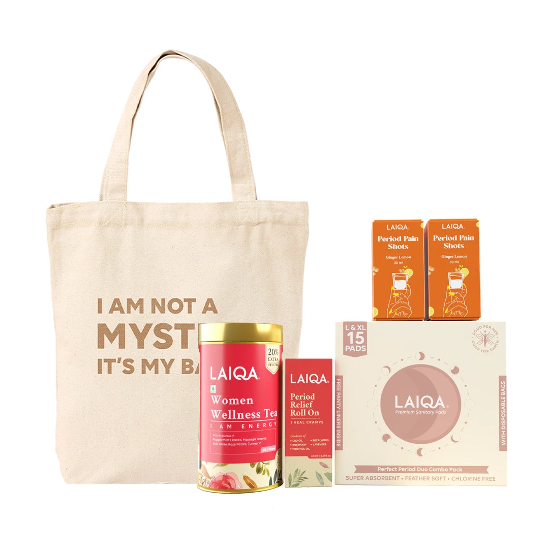 1 Wellness tea + 2 Period pain shots 30ml + 1 Combo duo pack ( 10 L + 5XL) + 1 Period relief roll on + free tote bag